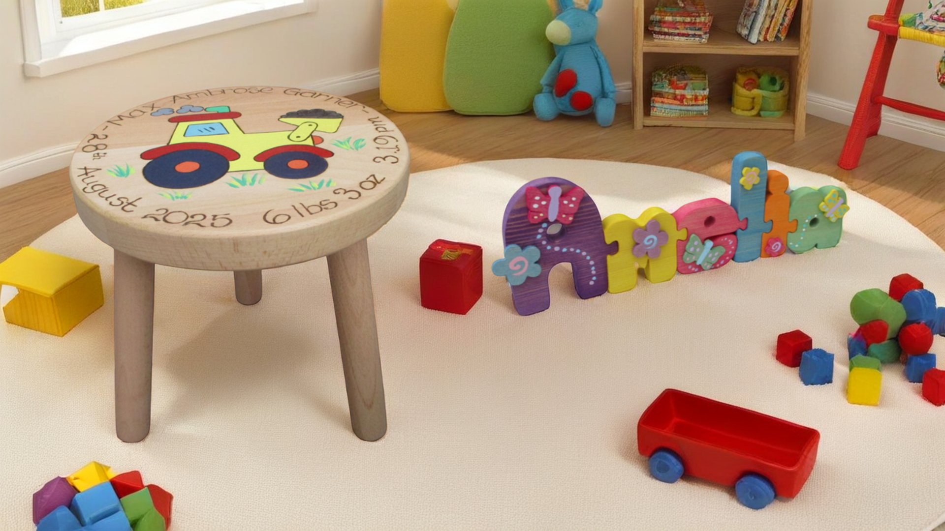 A range of wooden stools, name jigsaws, and door plaques made just for your little ones.