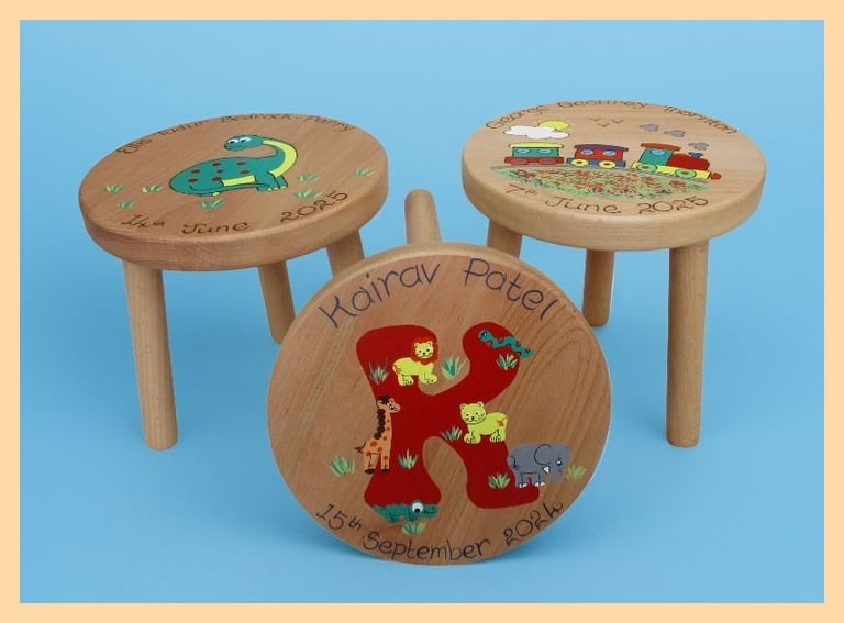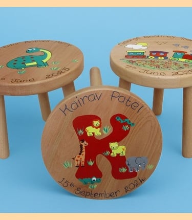 Here you can see a few examples of our personalised wooden stools. The personalisation and design is hand painted in our studio, we can even add an underside message making it a great keepsake gift. Visit our Children's Stools page for more details and to see our full range of designs.