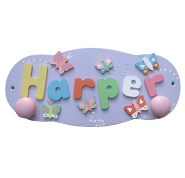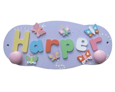 Great pastel coloured wooden name hangers for girls. Each hanger has 2 well spaced hooks and raised letters to give a 3 dimensional effect. Each board is decorated with hand painted butterfly and flower wooden cut outs.
